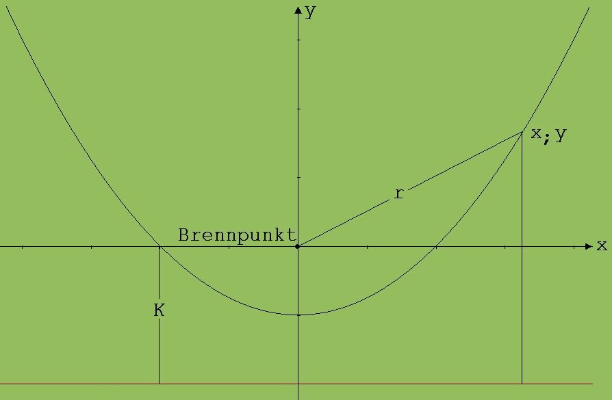 Liegt eine Gleichung der Form y = a × x2 + b vor, dann beschreibt diese Gleichung eine Parabel. Den Abstand d = K/2 des Brennpunkts vom Scheitel erhält man nach a = 1/(2×K).