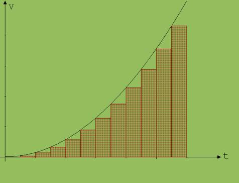 Die in Abb. 1 angedeutete Schätzung von s ist sehr grob. Zur Verbesserung der Rechnung muss Δt verkleinert werden. An der Abb. 4 ist erkennbar, dass die Summe der Δs mit kleiner werdendem Δt gegen einen Grenzwert strebt. Die Abweichung von dem maximal erreichbaren Wert ist kleiner als das Produkt aus Δt und der Endgeschwindigkeit vE . Dieses Produkt strebt mit kleiner werdendem Δt gegen 0.