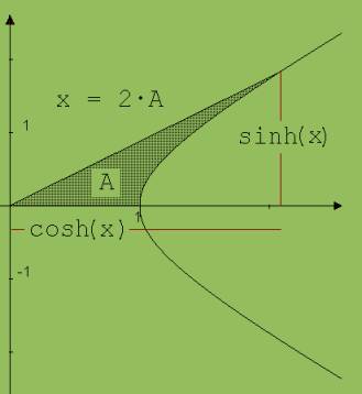 In der Abb. 2 ist die Bedeutung von sinh(x) und cosh(x) veranschaulicht. Hier wird A nicht durch einen Einheitskreis, sondern durch die Hyperbel x2 - y2 =1 begrenzt. x = 2·A/ Längeneinheit2