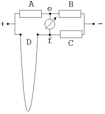 Wenn D belastet wird, dann zeigt das angeschlossene Messgerät von f nach e fließende Elektronen an. Eine Erklärung hierfür wird sofort gefunden. Die Leiter A, B , C und D, die anfangs übereinstimmende Widerstände hatten, werden nun nicht mehr von gleich starken Strömen durchflossen, denn der Draht D hat nun einen höheren Widerstand als die anderen Leiter, da er bei Belastung länger und dünner wird. Zunächst verteilen sich die vom –Pol kommenden Elektronen je zur Hälfte auf B und C, dann aber zieht ein Teil der durch C fließenden Elektronen den Leiter A wegen seines geringeren Widerstandes dem Draht D vor und nimmt den Weg über das Messgerät, welches eine der wirkenden Kraft proportionales Signal anzeigt.