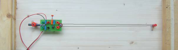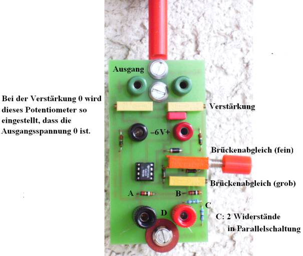 Das Kernstück des Drahtmesswandlers ( siehe Abb. 3: Leiterplatte mit Bauelementen ) ist die in der Abb. 1 sichtbare Wheatstonebrücke. Sie besteht aus vier 15 Ohm-Widerständen A, B , C und D. D ist ein 90 cm langer als Messelement dienender Konstantandraht (Durchmesser 0,2 mm), der zwischen zwei Polklemmen frei durchhängt. Die Brücke wird an eine 6-V-Spannungsquelle angeschlossen. Neben dieser Messbrücke trägt die Leiterplatte noch einen Verstärker für das Messsignal.