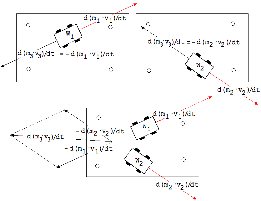 Auf der zunächst ruhenden Platte fährt ein Spielauto W1 mit der Masse m1 und dann in einem zweiten Versuch ein Spielauto W2 mit der Masse m2 an .