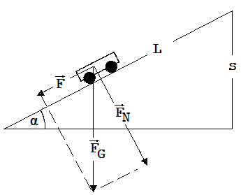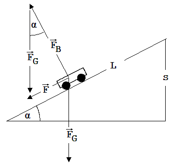 Beweis: Die Beschleunigung eines Wagens der Masse m entlang der schiefen Ebene weist auf eine Kraft F (Hangabtriebskraft) parallel zu dieser Ebene; sie ist die Resultierende der auf den Wagen wirkenden Kräfte. Auf den Wagen wirkt die Erde mit ihrer Anziehungskraft FG und die Schiefe Ebene mit einer Abstoßungskraft FB . Von Reibungskräften soll abgesehen werden.