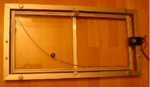 Die Abb. 6 und 7 zeigen eine in Querrichtung geneigte Wippe (die Schmalseiten sind geneigt, die Längsseiten verlaufen waagrecht), auf der eine Kugel entlang einer vorgeschriebenen Bahn hinab rollt. Die Bahn ist jeweils durch einen Schweißdraht (Durchmesser = 4 mm) vorgegeben, der zwischen zwei diagonal gegenüber liegenden Ecken der Wippe eingespannt ist.