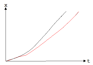 Die in den Abbildungen erkennbaren Bahnen nehmen vor dem unteren Ende einen waagrecht Verlauf an, somit werden die mit der Geschwindigkeit 0 am oberen linken Ende der Bahn beginnende Bewegungen am Ende gleichförmig. In der Abb. 8 sind die zugehörenden Weg-Zeit-Diagramme zu sehen ( das obere ist der Abb. 6 und das untere der Abb. 7 zuzuordnen). Beide Diagramme haben am Ende gleiche Steigungen und zeigen somit gleiche Endgeschwindigkeiten an.