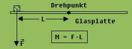 Für die Drehung der Platte ist das als Drehmoment bekannte Produkt M = F · L entscheidend. F ist die drehende Kraft ( hier eine Gewichtskraft ), L ist der Hebelarm, der Abstand der Drehachse vom Kraftpfeil oder dessen Verlängerung – der Anfang des Kraftpfeils ist am Angriffspunkt der Kraft. Die von dem aufgesetzten Gewicht verursachte Drehung der Wippe und das diese Drehung anzeigende elektrische Signal ist bei Drehmomenten < 5 N · m proportional zu M.