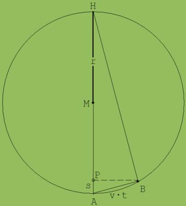 Das Dreieck ABH in dieser Abbildung ist nach dem Satz des Thales ein rechtwinkliges Dreieck. Es vergeht die Zeit t, während P den Weg s von A nach B zurücklegt. Der Kreisbogen AB weicht bei kleinem t nur sehr wenig von der Kathete AB ab. Es gilt somit nach dem Kathetensatz:
