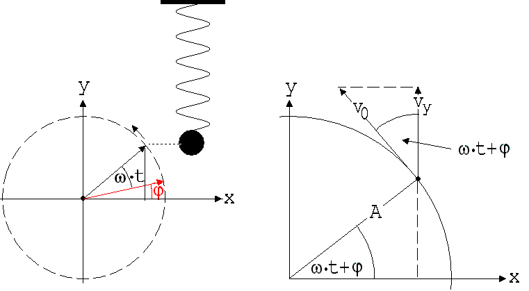 Wenn der mitlaufende Zeiger der Länge A den Winkel φ mit der durch den Schwingungsmittelpunkt laufenden x-Achse bildet, dann wird die Stoppuhr auf 0 gestellt. Zum Zeitpunkt t bildet der Zeiger den Winkel ω·t + φ mit der x-Achse. Für die Auslenkung y (Elongation) gilt dann: