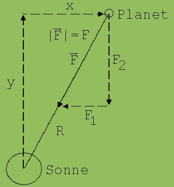 - F1 / F = x/R F = G · m · M / R2 m: Masse des Planeten M : Masse der Sonne F1 = -F ·x /R → F1 = - (G · m · M / R3) · x ) → a1 = - (G · M / R3) · x ) Entsprechend erhält man für F2 und a2 : → F2 = - (G · m · M / R3) · y ) → a2 = - (G · M / R3) · y ) Zur Abkürzung schreiben wir i für G · M / R3. → a1 = - i · x ; a2 = - i · y |