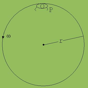 Abb.1 zeigt einen rotierenden zylindrische Raum in der Draufsicht. Ein an der zylindrischen Außenwand des Raumes stehender Mann P wird von einer Zentripetalkraft FZ = m · ω2 · r auf einer Kreisbahn gehalten. P übt eine gleich große Gegenkraft F (Wechselwirkungsgesetz) auf die Wand aus. Da sich P im rotierenden Raum als ruhend ansieht, erkennt er F nicht als Reaktion auf eine von der Wand ausgehende beschleunigende Kraft. Er deutet sie stattdessen als eine aus der Ferne wirkende Kraft F (der Gravitationskraft vergleichbar), die von ihm an die Wand weitergegeben wird und nennt sie Zentrifugalkraft.