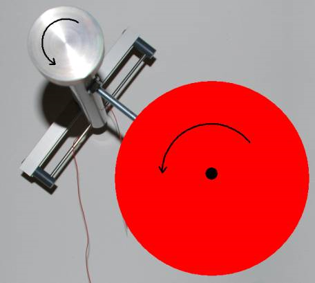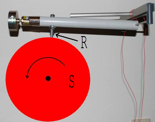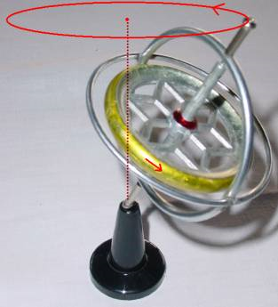 In Abb. 5 und 6 ist der Pendelkreisel auf einer rotierenden Scheibe S zu sehen. Der durch seinen Schwerpunkt geführte Rundstab R ist in S drehbar gelagert. Während der Scheibenrotation dreht sich der Pendelkreisel um R, bis seine Rotationsachse parallel zur Scheibenachse ist.