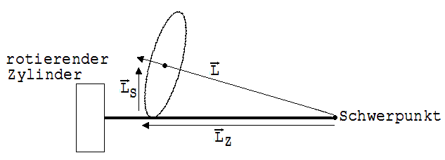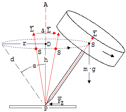 Zur Erklärung dieser Erscheinung dient die Abb. 2 Der rotierende Zylinder hat den Drehimpuls L, der während eines kleinen Zeitabschnitts Δt um ΔL geändert wird. ΔL/Δt zeigt das nach unten wirkende Drehmoment m·g·r der Gewichtskraft an. Der Kreisel wirkt mit einem dem Betrage nach gleich großen Gegenmoment der Gewichtskraft entgegen und hält somit seinen Schwerpunkt auf der in der Abb. 2 angedeuteten Kreisbahn (Radius r).