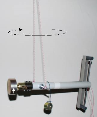 In Abb. 3 ist ein Kreisel mit waagrechter Rotationsachse zu sehen. Es handelt sich um den schon mehrfach erwähnten Pendelkreisel. Hier ist dieses Pendel an einem durch seinen Schwerpunkt geführten, waagrechten Rundstab aufgehängt. Die tragenden Fäden laufen nach oben hin zusammen. Wird am Pendel mit rotierendem Zylinder im Abstand d vom Schwerpunkt ein Gewicht mit der Masse m angehängt, dann dreht sich das Pendel um eine senkrechte Achse mit