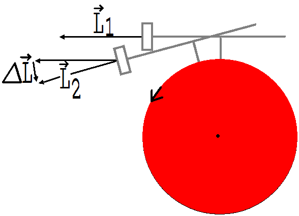 Zur Erklärung dieses Verhaltens dient die Abb. 7. Wir setzen voraus, dass der Pendelkreisel an einer Drehung um R gehindert werde. In diesem Fall erfährt er die Drehimpulsänderung ΔL, die durch ein Drehmoment verursacht wird, welches den Pendelkreises an einer Drehung nach vorne hindert. Ohne Behinderung erfolgt demnach diese Drehung.