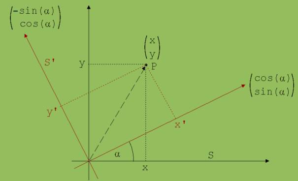 Einheitsverktoren der x' - und y'-Achse: ex = {cos(ω·t); sin(ω·t)} und ey = {-sin(ω·t); cos(ω·t)}