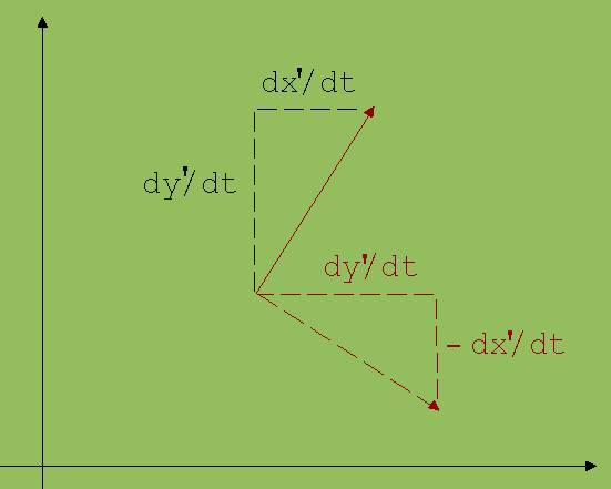 dx'/dt = dex /dt· r + ex · { dr/dt; dy'/dt } = ey · ω· r + ex · dr/dt
