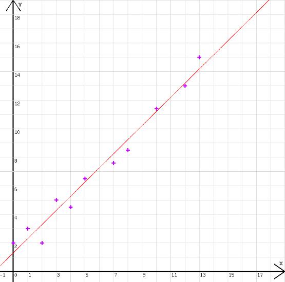 Die Abb. 3 wurde mit dem hier gegebenen Grafikprogramm erzeugt. Die Ausgleichsgerade y = 0,99·x + 1,29 ist zusammen mit den Punkten zu sehen, deren Koordinaten in der Tabelle stehen.