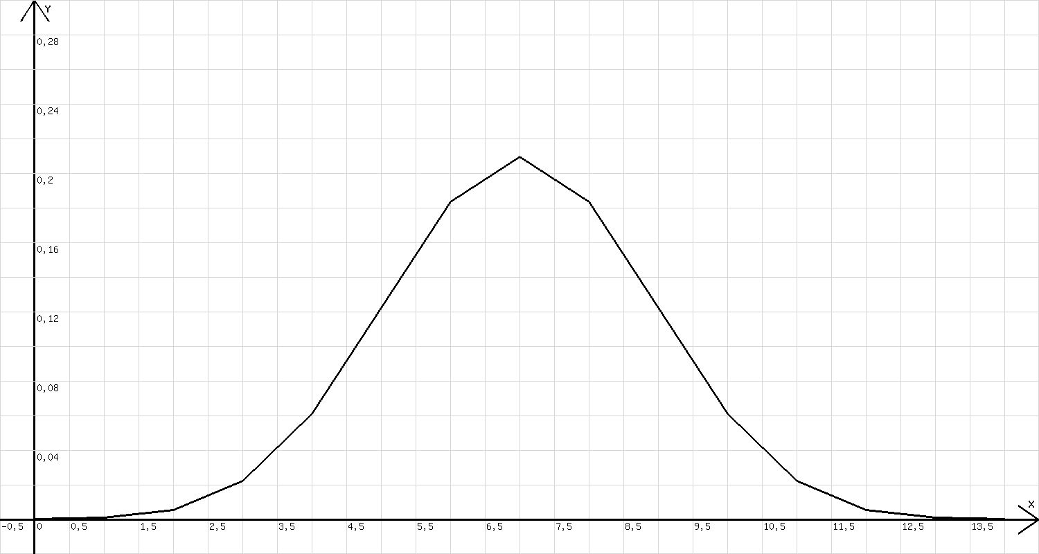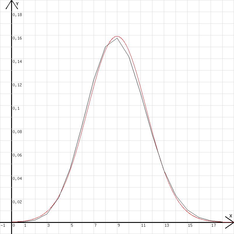 Das Diagramm (Binomialverteilung) in der Abb. 1 zeigt die Wahrscheinlichkeiten zu verschiedenen k = x für den Fall (m =14, p = q = 0,5). Es wird mit n=20;p=0,5;m=14;x=k; z=m!/(k!*(m-k)!)*p^m; k=k+1; l=x erzeugt ( pm = pk·q(m-k), p = q !) .