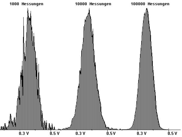 In den Abb. 11 und 12 sind Ergebnisse dargestellt, die im Messbereich ±1V aufgenommen wurden. Deutlich ist zu sehen, wie die Diagramme mit zunehmender Anzahl von Messungen mehr und mehr eine Glockenform annehmen.