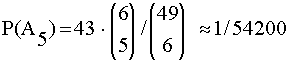 Die Berechnung der anderen Gewinnwahrscheinlichkeiten ist etwas schwieriger, da A5 , A4 und A3 durch viele Ergebnisse realisiert werden. Ein zu A5 gehörendes Ergebnis ist eine Auswahl von 5 richtigen Zahlen aus 6 richtigen Zahlen in Verbindung mit einer Zahl unter den 43 anderen falschen Zahlen. Da es insgesamt 6! / (5 ! · 1!) Fünferkombinationen aus 6 richtigen Zahlen gibt und diese Kombinationen mit 43 verschiedenen anderen Zahlen kombiniert werden können , gilt für P(A5):