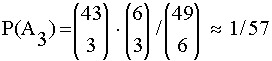 Anmerkung: Zur Berechnung von n über k wird im Rechenfenster von „Mathe.-Physik“ n#k eingegeben. So wird P(A3) mit 43#3 · 6#3 / 49#6 berechnet.