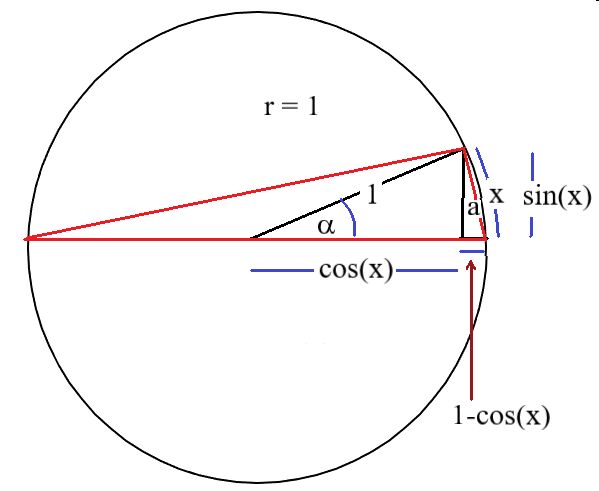 sin(x)2 = a2 - (1 - cos(x))2 ( Pythagoras !) → sin(x)2 / x2 = a2 / x2 - (1 - cos(x))2 / x2 .
