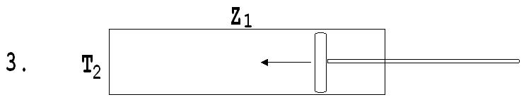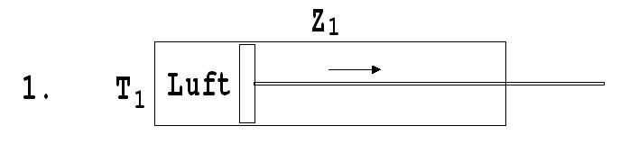 1. Luft mit der Temperatur T1 in einem Zylinder Z1 dehnt sich isotherm von V1 auf V2 aus. Hierbei verrichtet sie die Arbeit W1 = N·R·T1·ln(V2/V1) und nimmt aus ihrer gleich temperierten Umgebung die Wärme Q = W1 auf.