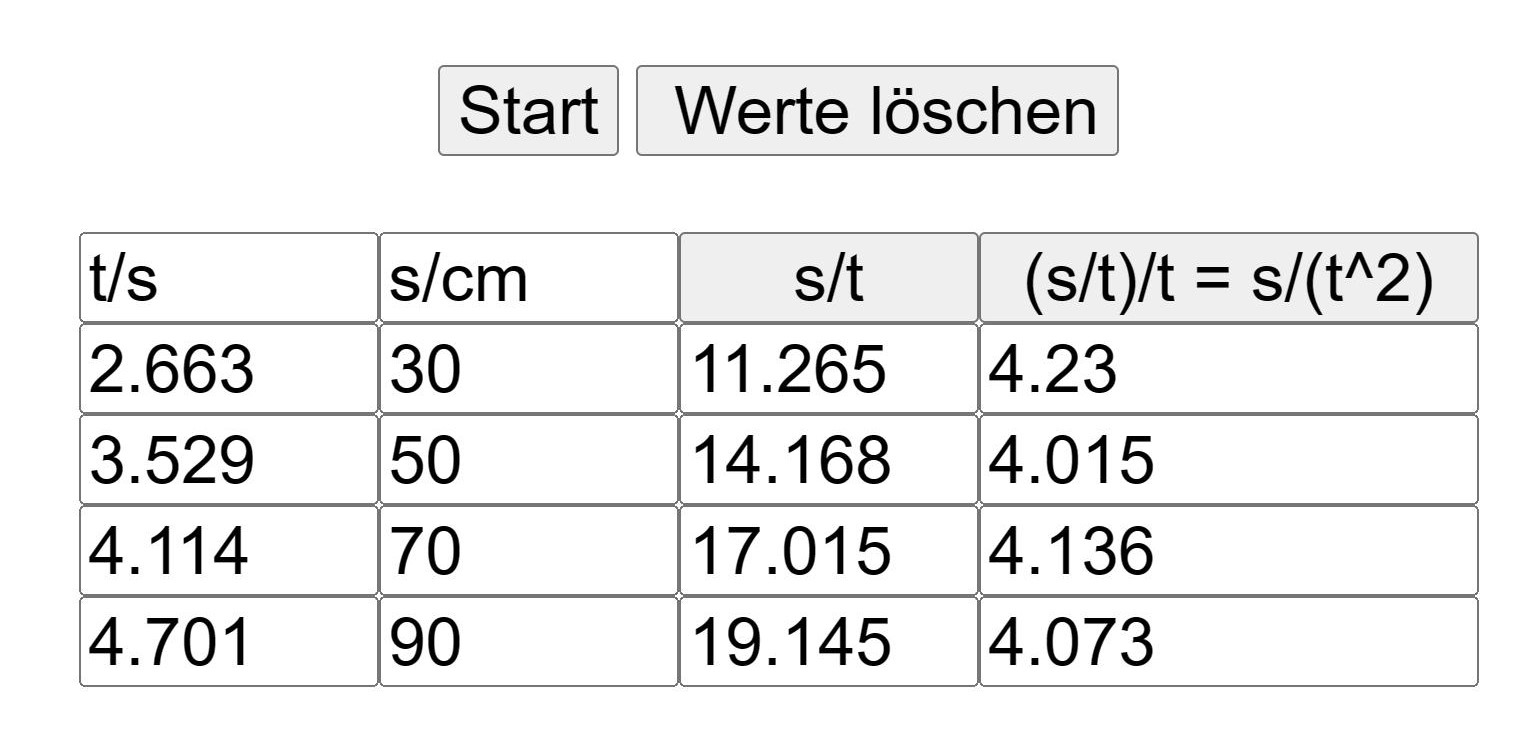 Eine Kugel rollt auf einer abwärts geneigten Rinne (siehe Abb.1) abwärts. Immer dann, wenn sie eine der angedeuteten Markierungen passiert, wird "Start“ auf der On-Line-Stoppuhr (siehe Abb. 2) der hier vorliegenden Internetseite angeklickt. Hierbei entsteht eine Tabelle, wie sie in der Abb. 2 zu sehen ist. Beim Start der Kugel wird das erste Mal auf Start geklickt. Der erste Eintrag erfolgt beim Passieren einer Markierung in 30 cm Abstand vom Startpunkt. Anschließend werden den eingetragenen Zeiten t die zugehörenden Wege s angefügt. Nach Anklicken von s/t und s/(t^2) werden die zugehörenden mittleren Geschwindigkeiten und halben Beschleunigungen in die Tabelle eingetragen.