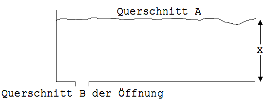 Eine quaderförmige Badewanne mit dem Querschnitt A = 0,8 m² läuft durch eine Öffnung am Boden mit dem Querschnitt B aus.