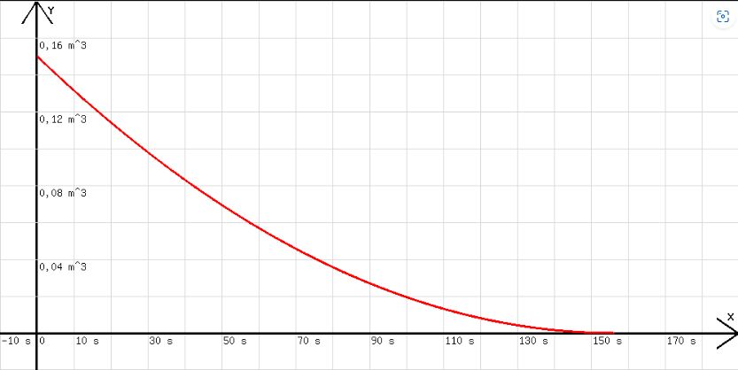 In Abb. 3 ist zu sehen, dass eine Wanne mit einem Querschnitt A =0,8 m2 , welche anfangs 0,15 m3 Wasser enthält, in ca. T =155 s durch ein Loch mit dem Querschnitt B = 10 cm2 = 0,001 m2 leer läuft.