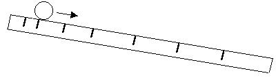 Eine Kugel rollt auf einer schiefen Ebene mit geringer Neigung abwärts. Immer dann, wenn sie eine der angedeuteten Markierungen passiert, wird mit einer Stoppuhr die Zeit erfasst. Anschließend werden den eingetragenen Zeiten die zugehörenden Wege angefügt.
