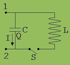 Eine Kombination aus einer Spule und einem Kondensator, wie er in Abb. 3 zu sehen ist, heißt Schwingkreis. Die elektrischen Schwingung, die nach Schließen des Schalters S in diesem Schwingkreis abläuft, soll nun mit einem kleinen Programm dargestellt werden. Zu der für die Berechnung der jeweiligen Kondensatorladung Q notwendigen Gleichung ( unter der Abb. 3) finden wir, wenn wir in Gedanken den Schwingkreis durchlaufen, zunächst vom Punkt 1 zum Punkt 2 und dann durch die Spule wieder zurück zum Punkt 1. Im ersten Schritt durchlaufen wir die Spannung – Q/C und im zweiten Schritt die Spannung I · R. Die Summe der beiden Spannungen ist gleich der Induktionsspannung - L · dI/dt. Q steht für die Ladung auf der unteren Kondensatorplatte.
