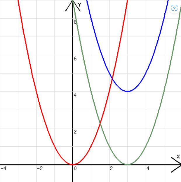 1.) Neben der Normalparabel (rot) durch den Nullpunkt des Koordinatensystems sind zwei weitere Parabeln zu y = (x-3)² (grün) und y = (x-3)²+4 (blau) abgebildet. Dass es sich bei der Parabel zu y = (x-3)² um eine nach rechts um 3 verschobene Normalparabel handelt, ist leicht einzusehen. y = (x - 3)² nimmt für z.B. x = 3 +0,1, x = 3+ 0,2 , x = 3+ 0,3 die gleichen Werte an wie y = x² für x = 0,1, x = 0,2, x = 0,3. Der Graph zu y = (x-3)² entwickelt sich demnach um x = 3 genauso wie der Graph von y = x² um x = 0. Wird zu y = (x-3)² die Zahl 4 addiert, dann werden die Punkte von y = (x-3)² um 4 angehoben. y = (x-3)² + 4 beschreibt demnach eine um 3 nach rechts und um 4 nach oben verschobene Normalparabel.