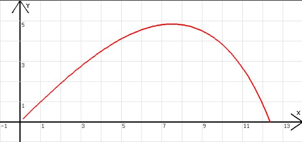 Neben der Reibungskraft wirkt noch die Gewichtskraft m·g. F1 = - v1· v · k und F2 = - g· m - v2 · v · k sind die x- und y-Koordinaten der auf die Kugel wirkenden Kraft. Zur Berechnung der Bahn mit dem hier vorliegenden Programm wird als Anfangswert für v1 /(m/s) = c und v2 /(m/s) = d der Wert 15, für den Reibungskoeffienten r / (kg/ m) der Wert 0,1 und für die Masse m/(kg) der Wert 1 eingetragen. Bei Bearbeitung der nachfolgenden Zeile liefert der Rechner die Wurfbahn in der Abb.5.