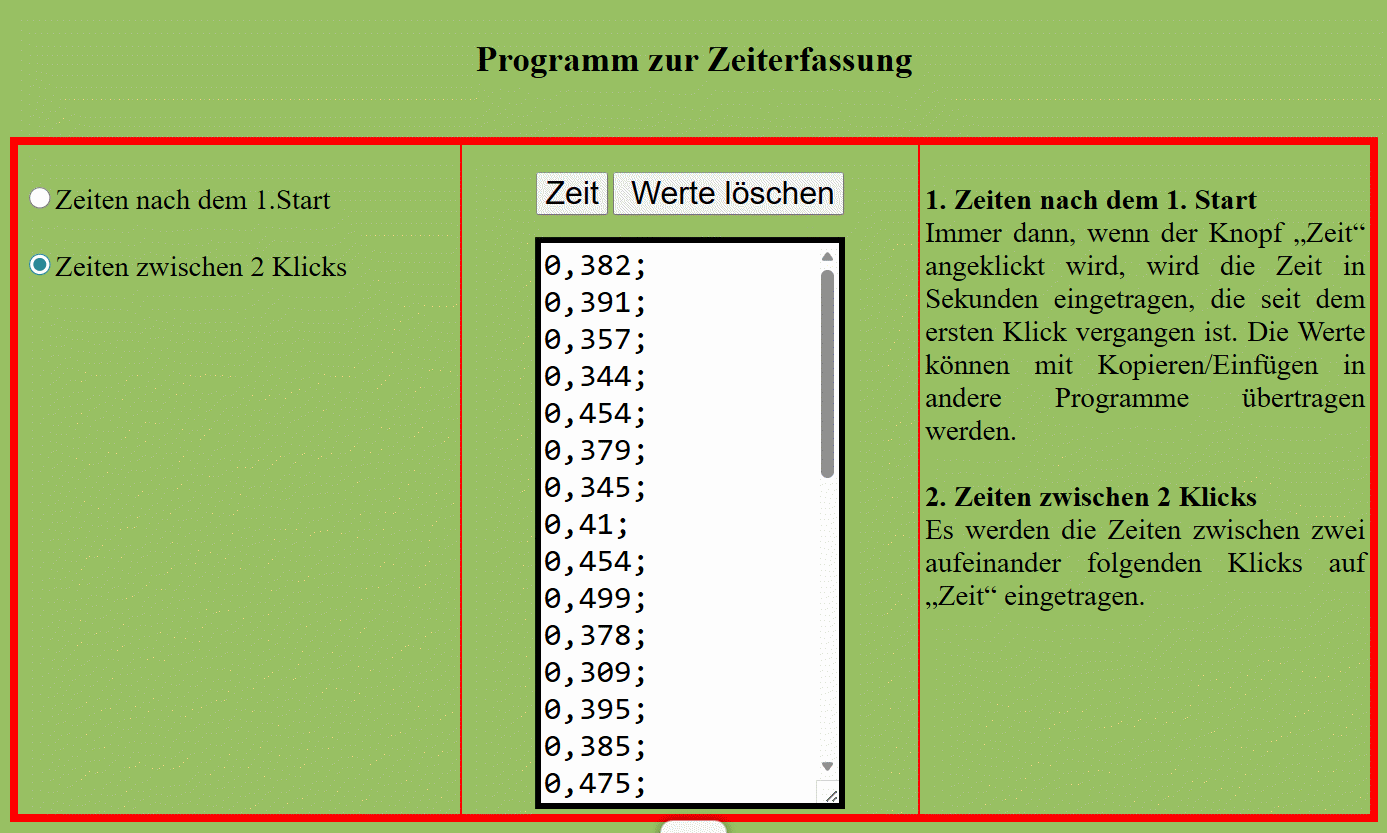 Das Zeiterfassungsprogramm wird auf „Zeiten zwischen 2 Klicks eingestellt (siehe Abb.6)“. Man lässt einen Malstift von der Tischkante aus zu Boden fallen (siehe Abb.5). Zu Beginn und am Ende des Falls wird „Zeit“ im Programmfenster des Zeiterfassungsprogramms angeklickt. Danach erscheint die Fallzeit im Tabellenfenster. Die Fallzeiten werden in das Tabellenfenster des Programms „Rechner.php“ übertragen. Mit n=w ;L=L+1;s=s+xT(L);m=s/L im Rechenfenster wird aus w Zeitwerten deren Summe S und Mittelwert m gebildet.