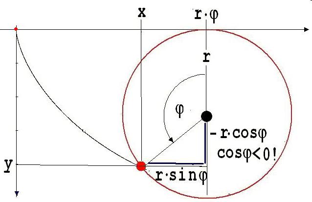 x = r · ( φ - sin φ ), y = r · ( 1 - cos φ )